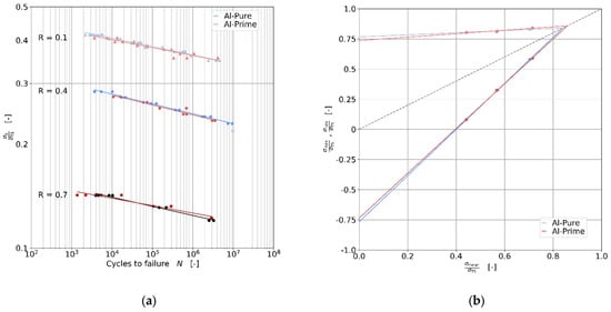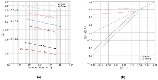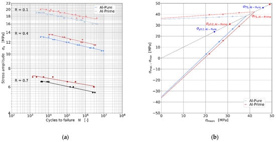 Wöhler diagram of Al-Pure and Al-Prime at R-ratios of 0.1, 0.4 and 0.7 (a), Smith diagram of Al-Pure and Al-Prime at 1,000,000 cycles with R-ratios of 0.1, 0.4 and 0.7 (b).
