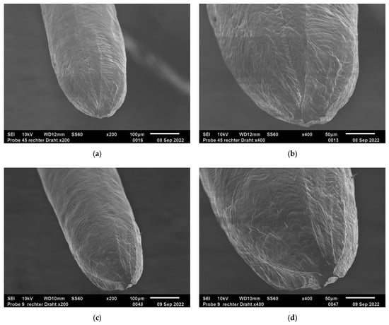 Selected samples of both wire types are investigated by the scanning electron microscope (SEM) after fatigue testing regarding their fracture behavior. Figure 8 compares exemplary the images of an Al-Pure wire loaded with a stress amplitude σa of 16 MPa (Figure 8a,b) and an Al-Prime wire loaded with a stress amplitude σa of 17.5 MPa (Figure 8c,d) at magnifications of 200 and 400. Both wires were tested with a R-ratio of 0.1 and each of the wires lasted more than 1,000,000 cycles.