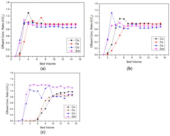 Due to the high metal concentration, the collected leachate with a 1/2 dilution ratio and pH values adjusted to 0.6, 1.0, and 2.0 were passed through the column packed with the IRC748 resin at a constant flow rate. The breakthrough curves were plotted as a dimensionless concentration factor C/C0 versus a dimensionless effluent volume, bed volume, BV. Figure 2a–c show the breakthrough curves for ion exchange at pH of 0.6, 1.0, and 2.0, respectively. At pH = 0.6, the carboxylic and amine groups in IRC748 resin are fully pronated, and all four metal ions cannot form complexes with IRC748 resin. Thus, the breakthrough curves at pH 0.6 show the fast breakthrough for all four metal ions. At pH = 1.0, the carboxylic and amine groups in IRC748 resin are partially pronated, and the selectivity of the resin upon all four metal ions starts emerging, as demonstrated. The affinity order of the metals for the IRC748 resin is Fe > Cu > Co = Sm. At pH = 2.0, the carboxylic and amine groups in the IRC748 resin are well pronated, and the selectivity of the resin upon all four metal ions is fully displayed. The apparent sequence of the affinity of the metals in the IRC748 resin is Fe = Cu > Co = Sm. The Fe and Cu breakthrough capacity reaches 6 BV, in comparison to 2BV for Co and Sm. This suggests that the IRC748 resin can successively separate Fe, Cu and Co, Sm at pH =2.0. Further increasing the pH causes the precipitation of Fe, and pH 2.0 was the optimum value for this separation. The obtained effluent containing Sm and Co was used for selective precipitation experiments.