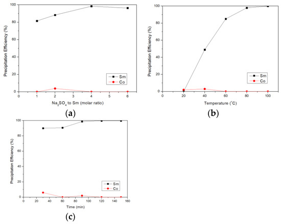 Effects of (a) Na2SO4 to Sm molar ratio, (b) temperature, and (c) time for the Sm precipitation.