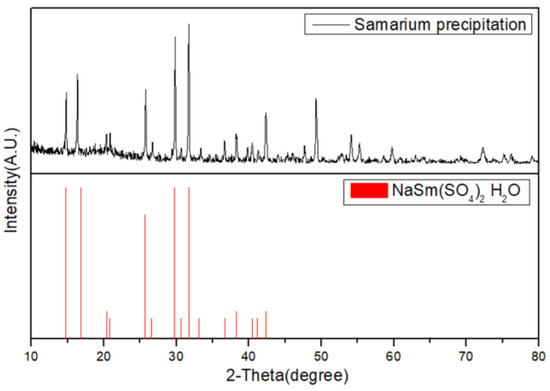 The precipitate obtained was analyzed by X-ray diffraction (XRD) and energy-dispersive spectroscopy (EDS). Figure 5 displays the results of the XRD analysis, and the major peaks of NaSm (SO4)2·H2O at 29.766°, 31.703° confirms the presence of crystalline NaSm(SO4)2·H2O as a dominate phase. There is only one sampling point in the EDS analysis, and the sample is a compacted powder. The results of the EDS analysis were shown in Table 3. The EDS analysis result showed that the molar contents of the Sm and Na in the precipitate were 13.23% and 12.08% respectively, which agrees with the theoretical values of 1:1.