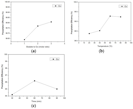 The results of the cobalt oxalate precipitation are shown in Figure 6a–c. The molar ratio and temperature did not play a significant role in the Co precipitation efficiency. When oxalic acid is added to the solution, no matter what the molar ratio or temperature is, more than 95% of Co can be precipitated. This result shows that oxalic acid is a very good precipitant for Co. In terms of time, the precipitation efficiency of oxalic acid is relatively slow, and it takes 60 min to precipitate more than 95% of the cobalt oxalate.