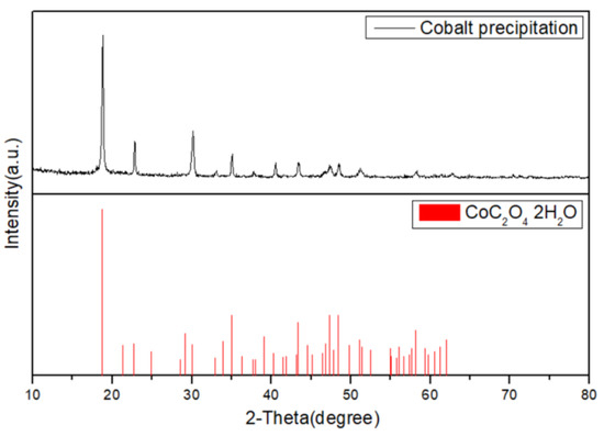 The precipitate obtained was analyzed by X-ray diffraction (XRD) and energy-dispersive spectroscopy (EDS). Figure 7 displays the results of the XRD analysis, and the major peaks of CoC2O4 at 18.745°, 34.98° confirm the presence of crystalline CoC2O4 as a dominate phase. There is only one sampling point in the EDS analysis, and the sample is a compacted powder. The results of the EDS analysis were shown in Table 4. The EDS analysis result showed that the molar contents of cobalt, carbon, and oxygen in the precipitate were 12.88%, 28.90%, and 57.55%., respectively, which agrees with the theoretical values of 1:2:4.