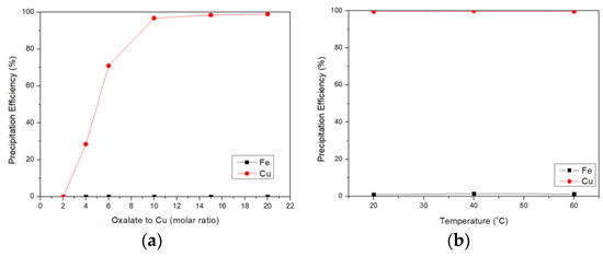 In terms of separating Cu and Fe, we refer to the studies of Soare et al. [31] and Makarova et al. [15] and found that oxalic acid has selective precipitation for Cu. The initial parameters are the molar ratio of 1 (theoretical ratio), normal temperature, a time of 30 min, and the pH value of the original elution. In terms of the selection of the experimental sequence, we choose to discuss the molar ratio first and then discuss the temperature, time, and pH. The reason is the same as that of Co precipitation.