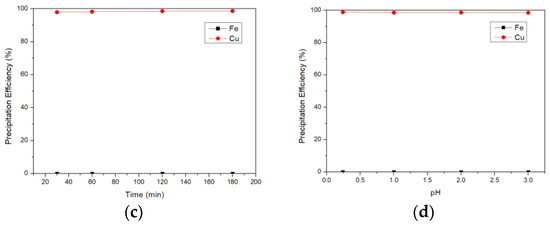 The results of the molar ratio and Cu precipitation efficiency are shown in Figure 8a. Because of the elution process, the pH of the solution is lower. Therefore, oxalic acid is difficult to dissolve in the solution, and an excessive amount of oxalic acid needs to be added to precipitate Cu. Compared with the molar ratio, the temperature, time, and pH value have little effect on Cu precipitation, as shown in Figure 8b–d. Regardless of how much the molar ratio is, the temperature, time, and pH value changed, and the co-precipitation efficiency of Fe was always less than 1%. This means that oxalic acid has good separation efficiency for Cu and Fe.