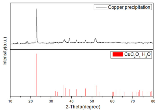 The precipitate obtained was analyzed by X-ray diffraction (XRD) and energy-dispersive spectroscopy (EDS). Figure 9 displays the results of XRD analysis and the major peaks of CuC2O4·H2O at 22.902°, and 36.251°, confirming the presence of crystalline CuC2O4·H2O as a dominate phase. There is only one sampling point in the EDS analysis, and the sample is a compacted powder. The results of the EDS analysis were shown in Table 5. The EDS analysis result showed that the molar contents of copper, carbon, and oxygen in the precipitate were 14.4%, 28.10%, and 51.50%, respectively, which agrees with the theoretical values of 1:2:4.