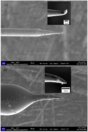 - Ju, B.-F.; Chen, Y.-L.; Ge, Y. The art of electrochemical etching for preparing tungsten probes with controllable tip profile and characteristic parameters. Rev. Sci. Instrum. 2011, 82, 013707. [Google Scholar] [CrossRef] [PubMed]
