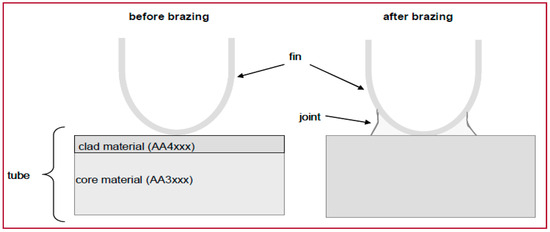 During the production of materials for heat exchangers, the Al sheets are multi-layered, consisting of at least two Al alloy layers. The core layer is often a manganese (Mn)-rich AA3xxx series alloy, which provides strength to the assembly, while the clad layer is a silicon (Si)-rich AA4xxx series alloy. The high Si content of the clad alloy sufficiently depresses the melting temperature such that, during brazing, the clad alloy is either partially or fully liquid, while the core alloy remains solid. The AA4045 alloy forms a eutectic during brazing. The brazing material is used to form heat exchangers and radiators, thus the sheets also need to be corrosion resistant. There are various methods used for cladding in the aluminum industry, e.g., strip cladding, roll-bonding, or welding, and in this study roll-bonding was applied.