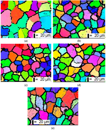 Figure 5a–e show the electron backscattered diffraction (EBSD) maps showing the microstructure of the AA-3003. Initially, the as-received alloy had large grain structure with average grain size approximately 90.8 μm. When the alloy is reheated for longer periods, the grain size decreases slightly. It can be seen that after holding for 38 h, the average grain size of the AA3003 alloy decreased from 90.8 to 77.1 µm. By reheating for longer periods, it slightly increases up to 86.9 µm which indicates that coarsening is the main mechanism to control the evolution of the microstructure. The quantitative values of average grain size of as-received and non-roll-bonded samples are listed in Table 2. One can also see that the grains are smaller at 38 h than that of the as-received material (see Figure 5e).