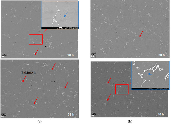 Figure 6 shows the SEM micrographs of the AA3003 alloy reheated to 505 °C, and held for 20, 30, 38, and 40 h, showing the formation of precipitates (dispersoids) and the evolution of the morphology of the primary or constituent particles, shown in red arrows. When the alloy is reheated for longer periods, the size of the primary particles slightly increases, which indicates that coarsening is the main mechanism to control the evolution of the primary particles. The dispersoid phase competes with constituent particles for the solute and this can lead to the dissolution of dispersoids in the regions adjacent to large constituents on prolonged heating (as part of this study), leading to dispersoid-free zones adjacent to coarse constituent particles. A large quantity of rod-like, plate-like, and network eutectic primary particles are distributed in the interdendritic regions and grain boundaries. A slow increase in the average thickness of particles can also be observed, especially for those held at ≥38 h.
