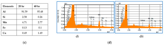 (a,b) SEM-BSE images of the AA3003 alloy reheated and held for 20, 30, 38, and 40 h, showing the evolution of the morphology of the primary particles (shown in red arrows). The precipitates are shown in the insert, which is approximately taken from the position indicated by the square frame. (c) the compositions (mass %) of the precipitates were identified and (d) the EDS spectra of the precipitates after, (di) 20 h and (dii) 40 h.