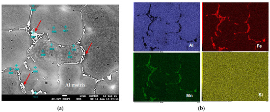 Figure 7 presents the morphology of the Fe, Mn-rich constituent particles in the as-cast AA3003 alloy characterized by SEM with corresponding EDS elemental mapping results. As can be seen in Figure 7, the constituent particles of the skeletal shape are distributed mainly in the inter-dendritic regions, and most of them have been identified as the Al6(Mn,Fe) phase by EDS and were formed during solidification. These intermetallic particles were also found to contain Fe, Mn, and Si (Figure 8). The resolution of EDS is in the range of some µm, so the aluminum matrix also influences the EDS. EDS results showing an estimation of the measurement error are summarized in Table 3. Both the iron and manganese content of the Al6(Mn,Fe) phase seemed to be stable as the soaking time increased, indicating that the latter did not attain an equilibrium state during the DC casting process. The Al-matrix also does not change in chemical composition. This is evidence that it is not only the formation of fine precipitates from supersaturation at extended soaking times, but that further transformation of the Al6(Mn,Fe) phase took place. According to Hamerton et al. [17], Al6(Fe,Mn) has an acicular shape in the as-cast sample; and after long heat treatment, they become coarser. It must be noted that EDS alone is not sufficient for phase analysis and transmission electron microscopy (TEM) is planned to be conducted.