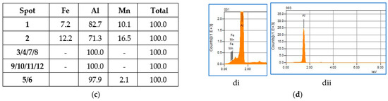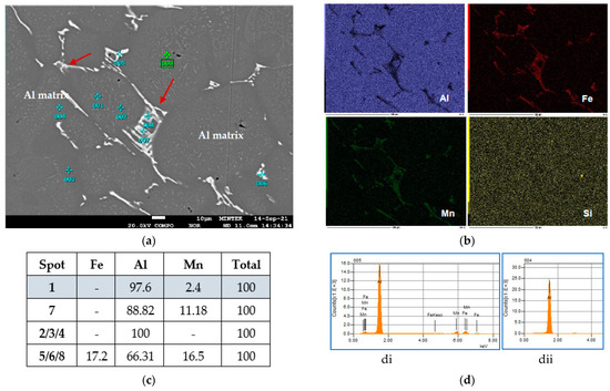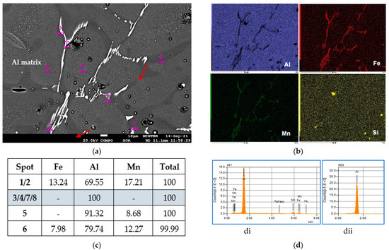 (a) SEM-BSE image of the reheated material and that held for 45 h for the AA3003 alloy, (b) elemental maps by SEM-EDS showing: aluminum; iron, manganese, and silicon maps, respectively, (c) the compositions (wt.%) of the constituent particles were identified, and (d) the EDS spectra of the constituent (di) and the Al matrix (dii).