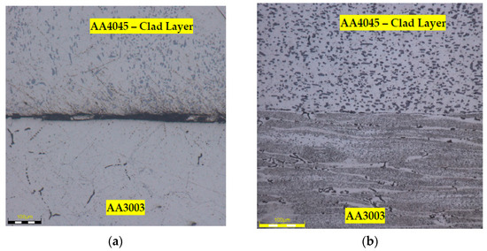 Optical micrographs of AA4045/AA3003 showing (a) sandwich samples before roll-bonding and (b) after a 60% reduction showing a good bonding interface.