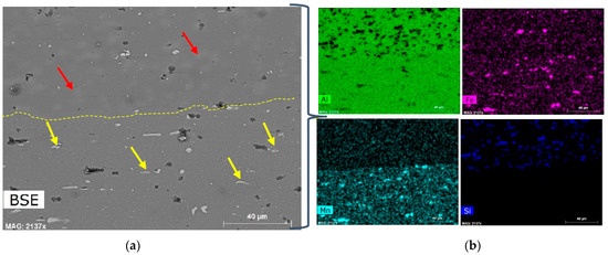 Figure 11a shows the SEM images of the Al cladding alloys after sheet processing to 0.3 mm including annealing (i.e., soaking for 20 h at 505 °C, cold-rolled and annealed at 330 °C for 3 h (S-CRA)) indicating Si particles distributed in the clad layer (red arrows). Due to the high roll-bonding temperature, the interface is almost invisible; resulting in a complete metallurgical fusion, shown by a yellow line and arrows showing particles in the core. The thickness of the cladding layers was about 90 to 100 µm. The manganese map by SEM-EDS in Figure 11b shows a distinct interface between the substrate AA3003 and the cladding AA4045. The reheating and subsequent hot- and cold-rolling led to the breakdown, spheroidization, and uniform distribution of the eutectic Mn-Fe particles of AA3003. As expected, the microstructure is inhomogeneous and reveals various precipitates and particles such as Al–Fe–Mn–Si block-like and α-Al(Fe,Mn)Si precipitates shown by yellow arrows. This shows α-Al, Si and AlFeSi phases on the AA4343 clad material side, and α-Al, Al6Mn, and AlFeMnSi phases on the AA3003 core material side. In the literature [27,28], the roll-bonding process has a significant grain refinement effect on aluminum alloys, and the process parameters must play an important role in the microstructure of the final products. Therefore, further studies need to be conducted to optimize the roll-bonding process. The effects of process parameters such as the rolling speed and temperature on microstructures should particularly be focused on. After hot- and cold-rolling of the as-received material, large particles of intermetallic (mainly in the form of Chinese script morphology consisting of Fe-Mn-Si) were broken into smaller particles with an increased Fe, Mn, and Si content, indicating the formation of an α-Al(Fe,Mn)Si phase [29] as compared to before rolling.