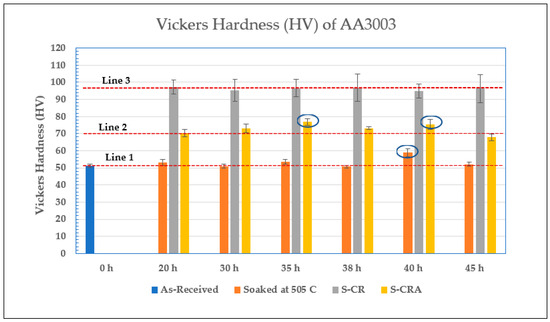 The hardness of all of the S-CRA samples (90% thickness reduction) were the same within error bars, i.e., with a slightly high hardness at 35 and 40 h (shown by a horizontal line, Line 2). Line 3 shows that there was an improvement in the hardness of S-CR for all soaking times, possibly due to the cold-rolling (strain hardening) effect. The increase in hardness, as the result of cold work, is due to the strain-hardening mechanism of this alloy. Cold-rolling induces dislocations, contributing to increased hardness. Cold-rolling achieves very high strains, which can be as high as six to seven in thin gauge foil rolling, and the strength attained relies on maintaining a level of work hardening even at high strains [31]. The formed dispersoids provide a significant direct strengthening effect and influence the work-hardening behavior of the material.