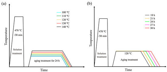 Single-stage aging heat treatment scheme for Al-Zn-Mg-Cu alloy sheets. (a) Single-stage aging heat treatment scheme with different aging temperatures, (b) Single-stage aging heat treatment scheme with different aging time.