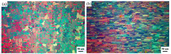 Figure 2 illustrates the microstructure along the longitudinal section of the annealed thin sheet. As depicted, the internal grain structure of the aluminum alloy thin sheet exhibits a relatively flattened equiaxed morphology with consistent grain sizes. The mechanical properties of the annealed samples are listed in Table 2. The sheet’s yield strength is 102.5 MPa, tensile strength is 219.5 MPa, elongation is 21.28%, and the hardness is 65.46 ± 3.5 HV.