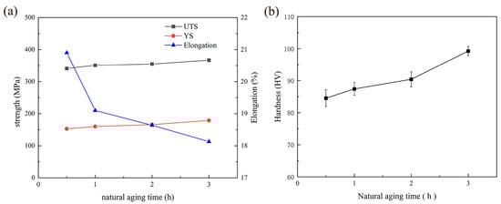 Variation of mechanical properties of Al-Zn-Mg-Cu alloy thin sheets with natural aging time. (a) Tensile properties, (b) Hardness.