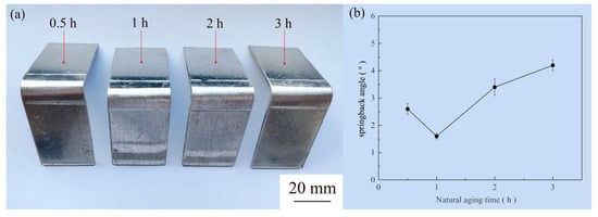 The images in Figure 4 depict the macroscopic appearance of samples after bending deformation following various durations of natural aging, along with the corresponding springback angles. Notably, it is observed that when the natural aging time remains within 3 h, there are no noticeable cracks on the sample surfaces after the bending deformation. Furthermore, measurements indicate that as the natural aging time is extended, the springback angle of the samples initially decreases before subsequently increasing. For instance, at a natural aging time of 1 h, the springback angle of the samples measures only 1.6 ± 0.1°.