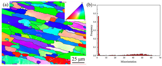 EBSD analysis of T4N1 sample. Grain map (a) and distribution map (b) of grain boundary misorientation.