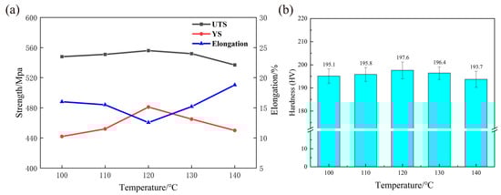 Figure 6 illustrates the patterns of change in tensile performance and hardness during the single-stage aging of Al-Zn-Mg-Cu alloy thin sheets across different aging temperatures. As depicted, the variation in tensile strength remains relatively minimal within the temperature range of 100 °C to 130 °C. However, a noticeable decrease in tensile strength occurs after aging treatment at 140 °C (a reduction from 556 MPa at 120 °C to 537 MP). Conversely, the changes in yield strength and elongation are more pronounced with increasing aging temperature. With the rising temperature, the yield strength initially increases before showing a subsequent decline, while the elongation rate initially drops before increasing again. At an aging temperature of 120 °C, the yield strength (481 MPa) reaches the peak value, coinciding with the lowest elongation rate (12.55%). From Figure 6b, it can be seen that the variation in hardness of the thin sheets during aging treatment between 100 °C and 140 °C is relatively small, fluctuating within the range of 193.7 HV to 197.6 HV. Additionally, when the aging temperature is 120 °C, the hardness of the thin plate is 197.56 ± 3.65 HV.