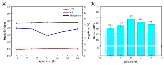 Tensile performance (a) and hardness (b) of Al-Zn-Mg-Cu alloy thin sheets under different single-stage aging treatments at various time intervals.