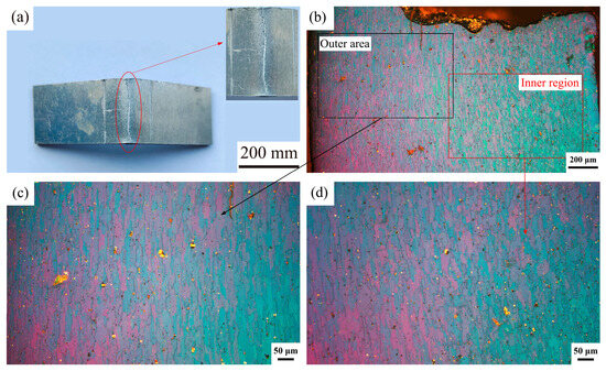 Figure 8 displays the macroscopic appearance and microstructure at the fracture surface of the sample (T6N2) following the process of solution treatment at 470 °C for 38 min, followed by aging treatment at 120 °C for 24 h. In Figure 8a, it is evident that pronounced cracks have emerged in the region of bending deformation in the sample. These cracks are situated precisely along the ridge line of the bending angle, exhibiting a fairly straight configuration that traverses the entire width of the sample. Figure 8b reveals distinct grain deformation in the bending deformation zone. The grains on the outer perimeter of the bending deformation zone (left section in Figure 8b) have elongated, as shown in Figure 8c. On the contrary, the grains inside the bending deformation zone have been compressed, presenting an equiaxed shape, but the degree of grain deformation is relatively small, as shown in Figure 8d. This observation underscores the subpar bending performance of the sample treated with the T6 treatment.