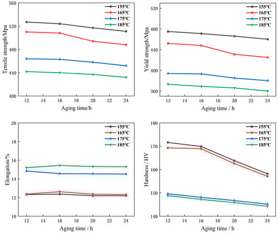 - As the single-stage aging temperature rises, the alloy demonstrates a pattern of strength and hardness, initially increasing and then decreasing, with yield strength being more responsive to changes in aging temperature. Conversely, the elongation of the alloy exhibits an inverse trend compared to its strength with respect to aging temperature.
