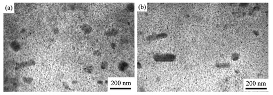 Figure 11 illustrates TEM bright-field images showcasing the precipitate phases in samples subjected to T6 and T74 treatments within this study. Within the images, a plethora of plate-like precipitate phases can be observed, uniformly dispersed throughout the aluminum matrix. Due to their relatively larger dimensions, these precipitates pose a challenge for dislocations to shear through during deformation. Consequently, dislocations tend to bypass these precipitate phases, with the alloy’s increased strength primarily attributed to Orowan strengthening [27]. This strengthening effect can be quantified as [31,32]:
