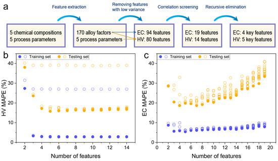 Figure 1a offers a comprehensive visualization of the FE process, delineating its influence on the reduction of the feature set. A preliminary step in the FE process involves the elimination of features with limited variance, as they contribute minimally to the predictive power of ML models. Specifically, attributes like sample thickness and reduction ratio display insufficient variability, rendering them ineffective for pattern learning. Features with a variance below a specified threshold (0.11 for EC and 0.07 for HV) are thus excluded to improve the dataset’s overall quality. To prevent feature redundancy and model overfitting, the subsequent stage of FE entails the removal of highly correlated features [15]. When the correlation coefficient between two features exceeds 0.95, only the feature with a higher correlation with the target variable is retained. The final step in the FE process employs recursive feature elimination to ascertain the optimal number of features instrumental for predicting both HV and EC effectively. Figure 1b,c elucidate the inverse relationship between the number of features and the prediction error, illustrating how feature quantity impacts model accuracy. Following this rigorous examination, a set of four key features for EC and five key features for HV were isolated, as they yielded the lowest prediction errors in the test set. Additional information on the features retained after each screening phase can be consulted in Supplementary Table S3. It is worth noting that the exclusion of HT as a feature in the HV model resulted in a significant increase in the HV’s MAPE, thereby accentuating the crucial role of HT in determining HV values.