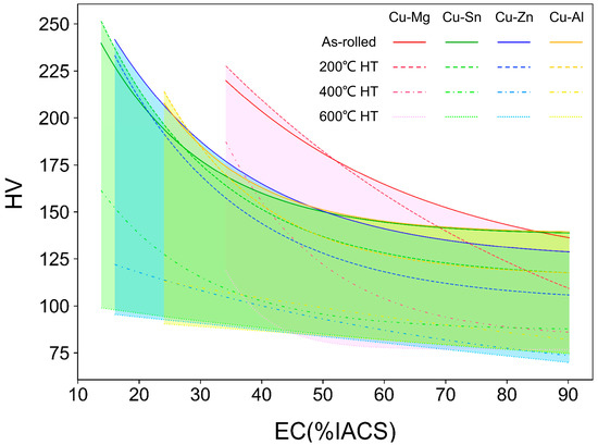 Combinations of EC and HV of various SSCAs (Cu-Mg, Cu-Sn, Cu-Zn, Cu-Al) under different processing conditions predicted by the ML models.