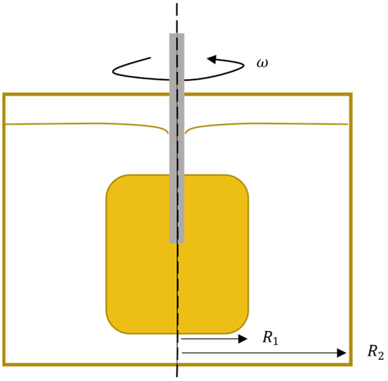 Under the assumption that the rotation dominates the flow direction, the EEM and ladle geometry could be seen as a Couette flow type, being the flow of a viscous fluid in the space between two surfaces, one of which is moving tangentially relative to the other (Figure 1). The steady flow in the circumferential direction, (m/s), can be described as [14]