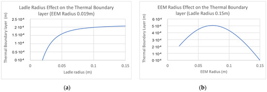 Here, (Pa s) is the viscosity, is the specific heat (J/kg K) and (W/m K) is the thermal conductivity. The effects of the ladle diameter are shown in Figure 2a, and the effect of the EEM diameter is shown in Figure 2b. Critical to note here is that as the ladle radius increases, the thermal boundary layer is monotonically increasing. However, as the EEM radius increases, there will be a maximum where the temperature gradient is steeper for both smaller and larger radii, representing a minimum in heat flux as the thermal gradient and the associated heat flux increases with a decreasing boundary layer.