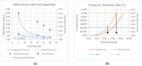 In Figure 3a, the current model is compared to the data from Payandeh et al. [10,11]. In this comparison, the difference was used as a fitting parameter. Figure 3a shows two dashed lines for 3 and 5 K differences. The value of used was that of Al-7Si-0.3 Mg, a common alloy used for , which matches a typical slurry temperature. In Figure 3a, the volume ratios for the experimental points, , have been recalculated to a freeze-on layer thickness. Taking data for dendrite growth rate and undercooling from Cho et al. [16] for an Al-7Si alloy, the growth rates are in Figure 3a. In the work by Payandeh et al. [10], the time to the peak volume of the EEM and freeze-on layer for Stenal Rheo 1 was reached after approximately 9 s. Taking this value as an estimate, the layer thickness can be estimated as a function of dendrite tip undercooling. This is shown in Figure 3b. Compared to the thicknesses found by Payandeh et al. [10], these correspond to undercooling in the range of 4–7 K. This suggests that the dendrite tip growth undercooling is essential in forming the freeze-on layer and is suggested to be the determining factor for the final slurry temperature.