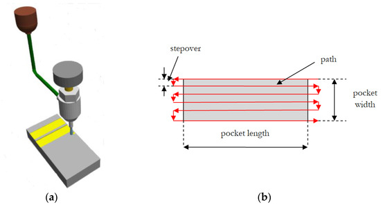 During the evaluation of the flatness of a surface, which is a form error, the surface should lie between two parallel planes and the tolerance value indicates the maximum distance of the two planes in length unit, whereas parallelism is an orientation error and is evaluated as the smallest possible distance between two theoretical parallel planes, which are also parallel to a reference surface (datum), such that all the measured points fall within this distance. In the present work, the flatness and perpendicularity were estimated based in measurements by the CMM machine on 12 points equally distributed on the pocket surface, a strategy which has also been employed in similar cases [39]. Especially for the parallelism error, the datum was chosen to be in the uncut surface of the workpiece which had low roughness in order to avoid interference with the measurement. Finally, for the determination of width, high-resolution images of the workpiece surface were analyzed by ImageJ software (version 15.3t, National Institute of Health and LOCI, University of Wisconsin, Madison, WI, USA).