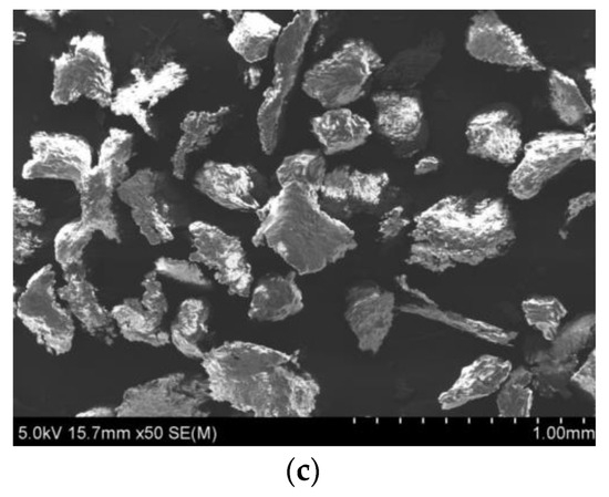 The experiments were performed on a model HWE-1520 H.G. RIDDER Automatisierungs GmbH machine (H.G. RIDDER H., Hamm, Germany). This machine has the capability to adjust the pressure from 50 to 400 MPa and abrasive flow rate from 10 g/min to 600 g/min. The ecological abrasive which was used is actually walnut shell, acquired by HERUBIN company (HERUBIN, Dobra, Poland). The geometry of the abrasive particles can be seen in the SEM (Scanning Electron Microscope, SU-70, Hitachi, Tokyo, Japan) micrograph in Figure 1c, which is rather uncommon in comparison to the more usually used garnet abrasive which has an irregular but prismatic shape, or glass beads which have an almost perfect spherical shape. This abrasive is considered an appropriate medium for machining of soft metals, surface cleaning and especially coating removal. It is considered reusable and according to the manufacturer it contains 55–70% cellulose, 19–22% lignin and 22–27% hemicellulose. Its density is estimated around 1.28 g/cm3 and its hardness is rather low, around 2.5–3 Mohs.