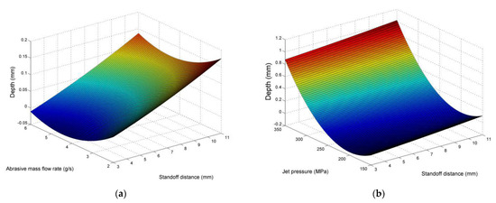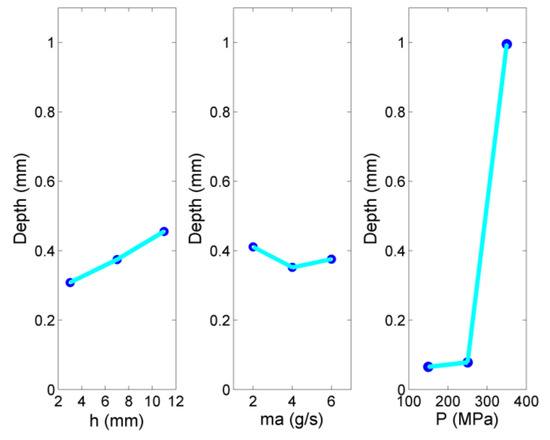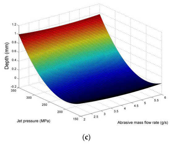 As can be seen in the main effects plot of Figure 2 and the surface plots of Figure 3, the jet pressure is definitely the most significant parameter regarding the pocket depth. When jet pressure increases, especially after 250 MPa, a tremendous increase in depth values occurs. This result indicates that the increase in particle velocity and the more intense interaction between the abrasives and workpiece surface can directly lead to increased material removal. Moreover, these findings are in accordance with the findings of previous works in the relevant literature, where it is underlined that jet pressure increases the momentum of the waterjet and subsequently the velocity of abrasive particles [45,46,47]. Thus, under higher jet pressure, it is easier to overcome the energy threshold for material removal [45]. It is also important to note that lower values of jet pressure have been reported to allow a more uniform erosion of the surface, whereas higher values of pressure can lead to lateral erosion as well, reducing the quality of the pockets and even creating a “speed bump” shape for the pockets [48]. However, as power consumption during AWJM is mainly dependent on jet pressure, using high values of jet pressure also increases the energy consumption and, apart from higher costs, contributes to a less sustainable process.