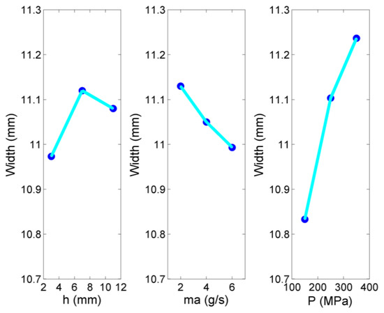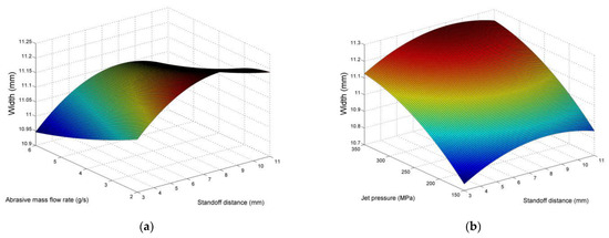 Regarding the variation of pocket width, it can be also related to the superposition of adjacent grooves formed by the movement of the abrasive jet over the predefined path. Pocket width is more relevant to the kerf width, as it actually occurs as a summation of adjacent kerfs; thus, it is expected to be correlated with the process parameters to a different extent than the pocket depth. The values of pocket width, presented in Figure 4 and Figure 5, show that the variation of this quantity is much lower than the variation of average pocket depth, even in harsher conditions. The main effects plot of Figure 4 indicates that pocket width values increase mainly due to the increased jet pressure values, as the higher amount of material removed through the more intense interaction of abrasive particles and workpiece surface also leads to larger width of the pockets. The effect of stand-off distance is more complex, as it contributes to an increase in width up to a point, due to the larger dispersion of abrasive particles, but after the stand-off distance is higher than a certain value, due to several reasons such as the reduction of energy of the particles, the width is less affected. Finally, the increase in abrasive mass flow rate leads to a slight decrease in kerf width, possibly to the increase in particle fragmentation.