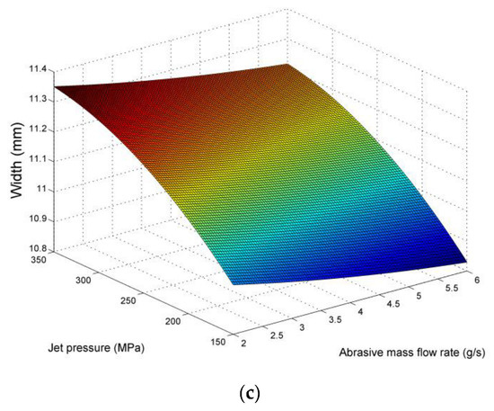 Surface plots for average pocket width in respect to (a) stand-off distance and abrasive mass flow rate, (b) stand-off distance and jet pressure, (c) abrasive mass flow rate and jet pressure.