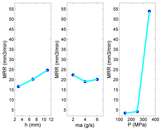 After having presented and discussed the results regarding depth and width of the produced pockets, the effect of process parameters on material removal rate will be discussed. In Figure 6, the main effects plot for MRR is presented. As it is expected, the material removal rate is highly correlated with the jet pressure which contributes to the enlargement of both pocket depth and width, something that was also observed in the relevant literature [48,49]. Taking into consideration that higher jet pressure also leads to higher energy consumption, it is necessary to perform a favorable compromise between two important targets, such as productivity and energy consumption, by regulating the values of jet pressure. On the other hand, the contribution of the two other parameters is rather minimal, as can be seen both in Figure 6 and Figure 7, with the increase in stand-off distance increasing the MRR due to the creation of wider pockets and the abrasive mass flow rate leading to a negligible decrease and subsequent increase in the MRR. Although these results were already anticipated based on the previous analysis of depth and width, it is worth noting that the magnitude of MRR is almost two orders of magnitude lower than the value obtained using other types of abrasives [46,49] in some cases, especially when jet pressure is minimal, rendering pockets with a depth of a few tens of micrometers; even at the highest pressure and abrasive mass flow rate values, it still remains under 100 mm3/min. The main reason for these observations is the considerably low hardness of the abrasive, being estimated around 2.5–3 Mohs, while garnet is usually reported to have a hardness of 7–7.5 Mohs. This result indicates that, although the use of softer abrasives even for cutting operations is justified under certain conditions, this organic ecological abrasive is not efficient for roughing but can used in conjunction with a harder abrasive in order to achieve both high productivity and better sustainability of the process.