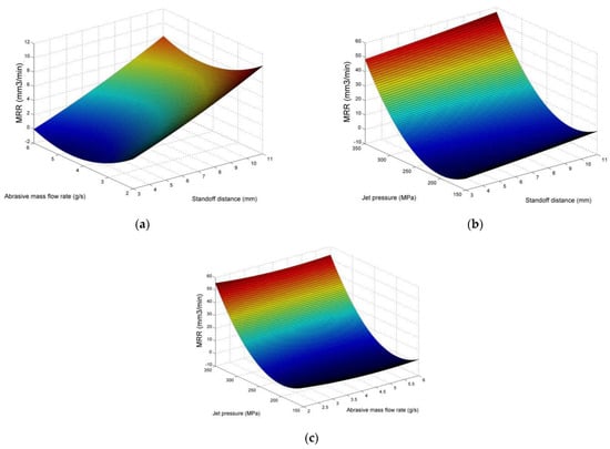 Surface plots for MRR in respect to (a) stand-off distance and abrasive mass flow rate, (b) stand-off distance and jet pressure, (c) abrasive mass flow rate and jet pressure.
