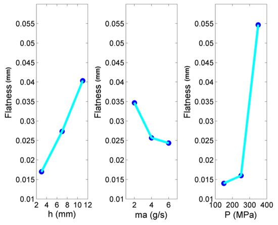 In the present case, the results indicate again that there is a considerable variation of flatness values in the conducted experiments. These differences can be mainly attributed to the increase in jet pressure rather than the other two parameters, as can be seen in the main effects plot of Figure 8. In fact, jet pressure is a very effective parameter for the regulation of pocket flatness, as low pressure leads to almost perfectly flat surfaces, but in the case of moderate or higher jet pressure values, the deviations can be considerably large. Thus, it becomes obvious that jet pressure does not only alter the topography of the surface but its form as well, with observable deviations occurring at higher pressure values. Thus, it is important to note that the largest increase in flatness deviation occurs for jet pressure values over 250 MPa. On the other hand, stand-off distance and abrasive mass flow rate have a lower contribution to the deviation of flatness, as can be also seen in Figure 8 and Figure 9. In detail, the increase in stand-off distance leads to slightly higher flatness deviation values due to the large area of dispersion of the abrasive particles and less focusing of the jet, whereas the mass flow rate increase leads to slightly lower flatness error, as in the case of depth, probably to due to higher fragmentation of particles which smoothens their geometry, reduces their cutting ability and contributes to the achievement of better uniformity of the produced surface. Thus, in order to achieve flat surfaces during AWJM, jet pressure values should be carefully chosen within the acceptable range, whereas the other parameters can be adjusted with more flexibility, taking into consideration other process outcomes as well.