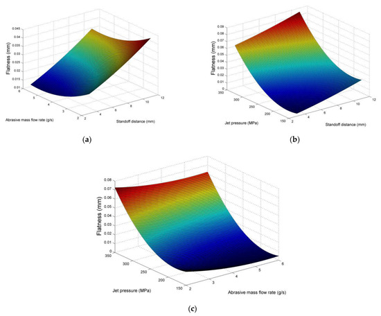 Surface plots for flatness in respect to (a) stand-off distance and abrasive mass flow rate, (b) stand-off distance and jet pressure, (c) abrasive mass flow rate and jet pressure.