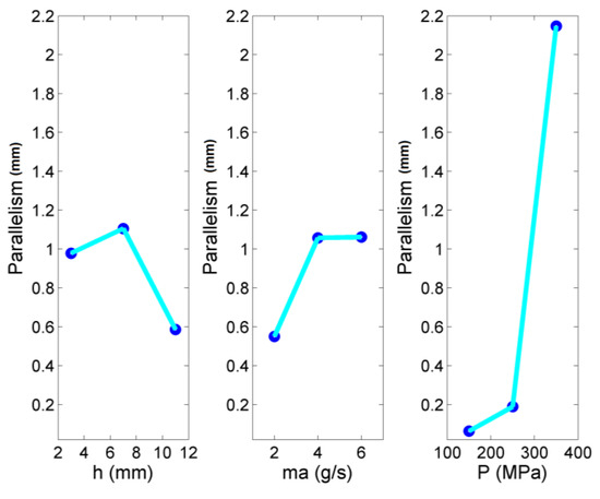 From the results presented in Table 3, it can be observed that the variation of parallelism error is very high, with negligible values in some cases and much higher values in others. The main effects plot of Figure 10 and the surface plots of Figure 11 provide the necessary information in order to observe the trends regarding parallelism error in respect to the three process parameters. As it was expected, the jet pressure is a prominent parameter for affecting parallelism of pocket surfaces to a large extent. The indication that, in the present case, pressure values over 250 MPa have a detrimental effect on the outcome of the process is once more justified, given that the parallelism error deviates significantly when pressure is increased over 250 MPa. On the other hand, the results regarding the other two parameters are less conclusive, as, apart from the weaker correlation with parallelism error, stand-off distance seems to lead to a slight increase in the error, after which the error is decreased, probably due to the larger dispersion of particles positively affecting their impact on the surface, whereas an increased abrasive mass flow rate leads to deterioration of parallelism until it reaches a critical value. These results are not important given the considerably low contribution of these parameters to the total variation of parallelism. Thus, in order to achieve the required parallelism of pockets, low to moderate jet pressure values are recommended.