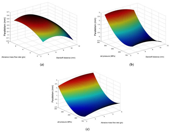 Surface plots for parallelism error in respect to (a) stand-off distance and abrasive mass flow rate, (b) stand-off distance and jet pressure, (c) abrasive mass flow rate and jet pressure.