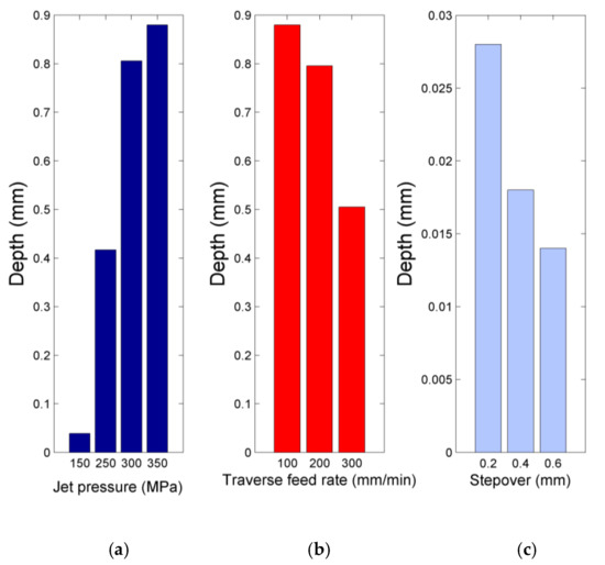Pocket depth variation in respect to (a) jet pressure, (b) traverse feed rate, (c) stepover values.