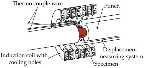 The normalized 22MnB5 steel exhibited an initial microstructure comprising equiaxial ferrite and globulitic pearlite, as illustrated in Figure 1. For experimentation purposes, cylindrical specimens were machined from a 9 mm thick plate, with their longitudinal axis aligned in the rolling direction. The specimens’ dimension was 5 mm in diameter and 10 mm in height. To delve into the process of SRX, stress relaxation tests were conducted using the BAEHR 805 A/D thermo-mechanical simulator. The experimental setup is depicted in Figure 2.