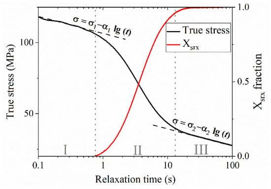 Typical relaxation stress–time curve, with recovery stage (no. I), post-deformation stage of recrystallization (no. II), and grain growth stage (no. III) [19].
