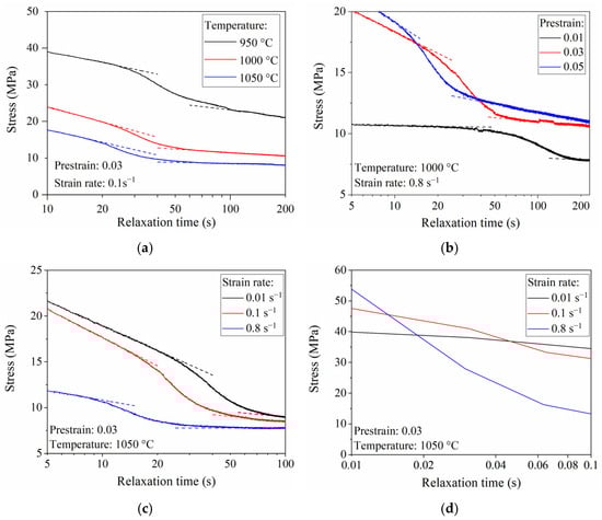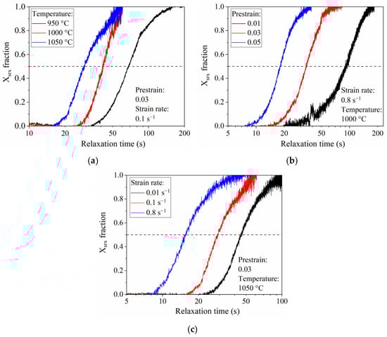 Focusing on Figure 6b, the relaxation curves obtained from the tests conducted under three distinct prestrains (0.01, 0.03, and 0.05) and a strain rate of 0.8 s−1 at a constant deformation temperature of 1000 °C are displayed. These prestrains correspond to minor deformations intentionally maintained below the critical strain of the alloy, as elaborated in [27], resulting in a relatively low dislocation density. In contrast to MDRX, SRX exhibits pronounced sensitivity to the degree of prestrain, displaying an accelerated recrystallization process as the degree of prestrain increases [25].